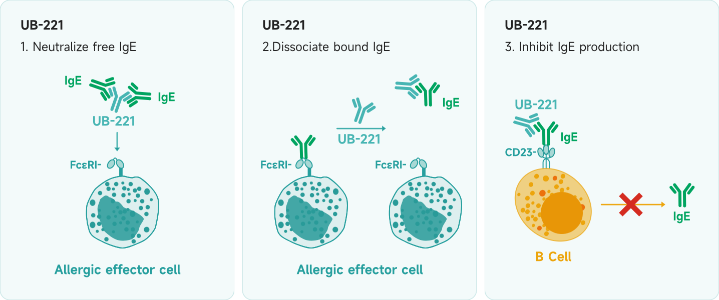 UB-221 is a next-generation product developed by Dr. Tse-Wen Chang, the inventor of omalizumab. It is a fully human, original monoclonal antibody formulated for subcutaneous injection. UB-221 not only neutralizes free IgE, which triggers allergic reactions, but also regulates the surface molecule CD23 on B cells, thereby inhibiting IgE production.
